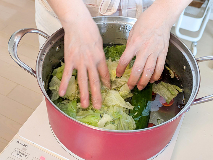 次に、レタスやキュウリやトマトなどの野菜をたくさん洗いましたが、あっという間に汚れも落ち、野菜のシャキシャキ感と甘みが増して信じられないくらい美味しくなりました。