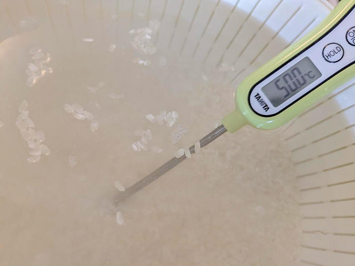3回ほど50℃のお湯で洗ったら、氷を入れて15℃に冷ましてから炊飯へ。