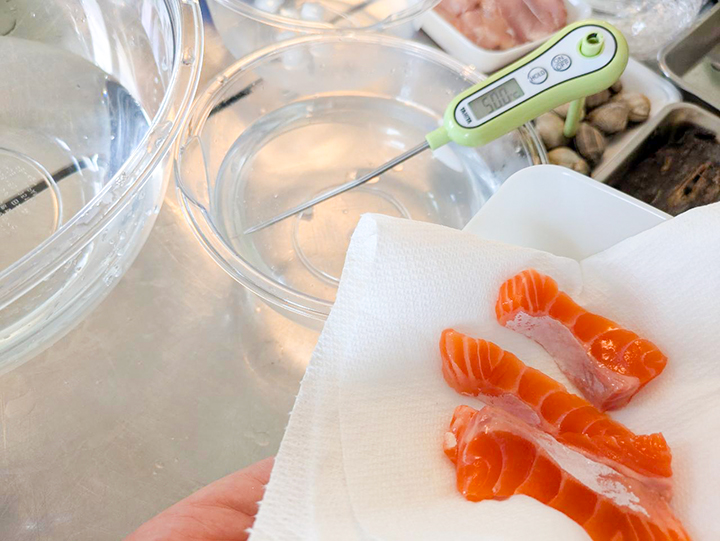 50℃のお湯を入れたボウルに食材を入れたらすぐ温度が落ちるので、52℃位からはじめても良くて、そのあたりの多少のずれは50℃前後、2~3度は大丈夫だそうです。