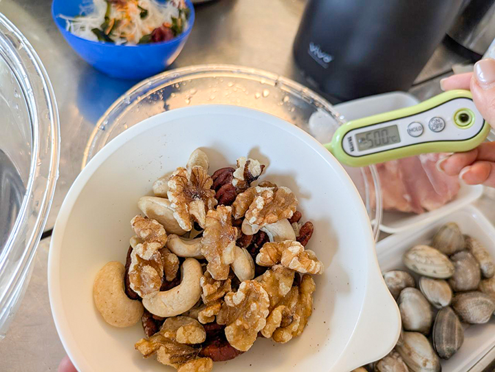 私も家に帰って、小松菜や人参などを50℃洗いしてみましたが、簡単で、シャキシャキの鮮度を感じられ、日持ちもして、まさにいいこと尽くし。特にお肉のぬめりなどが落ち、余分な脂も軽減されヘルシーに頂けて感激しました。
