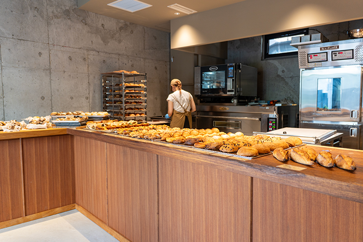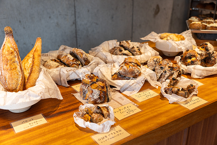 コンクリート打ちっぱなしの壁に、無垢材のパン台を合わせた店内は、シンプルでありながら温かみを感じる洗練された空間。