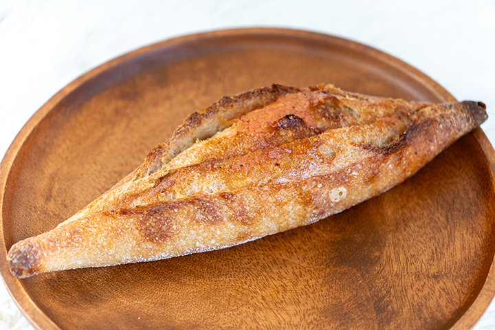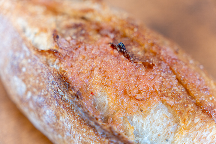 香ばしく焼き上げたハード系のパンに、自家製マヨネーズを合わせた明太子ペーストをたっぷりとのせています。