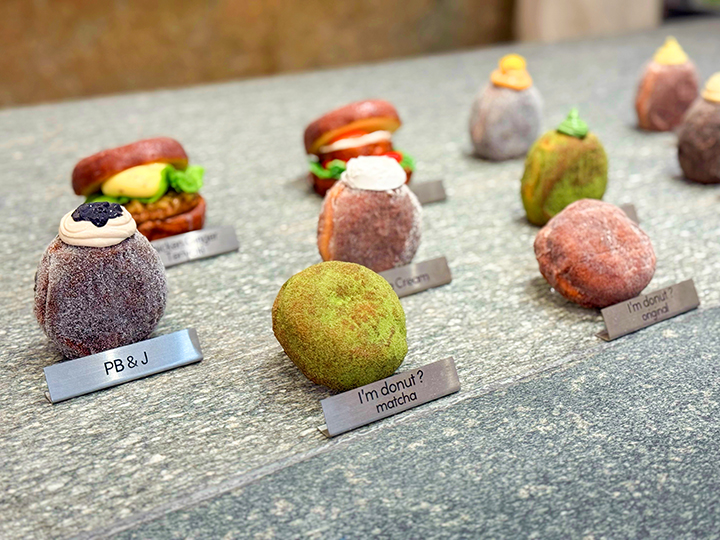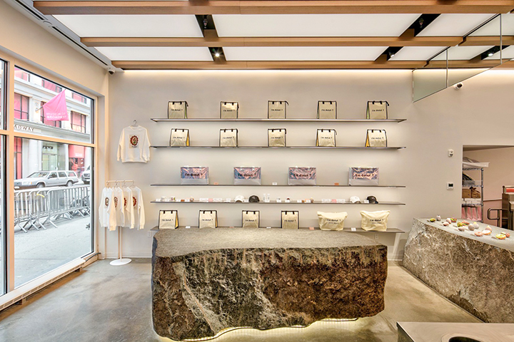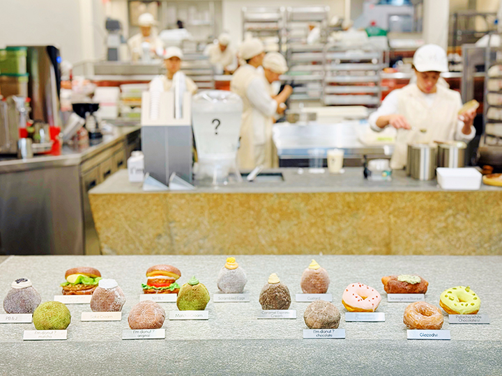 ショーケースではなく、まるでギャラリーのように美しく置かれたポップでかわいいドーナツたち。スタッフの制服もシンプルで洗練され、ブランドの世界観にぴったり。