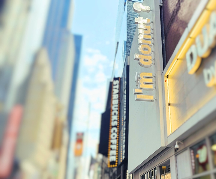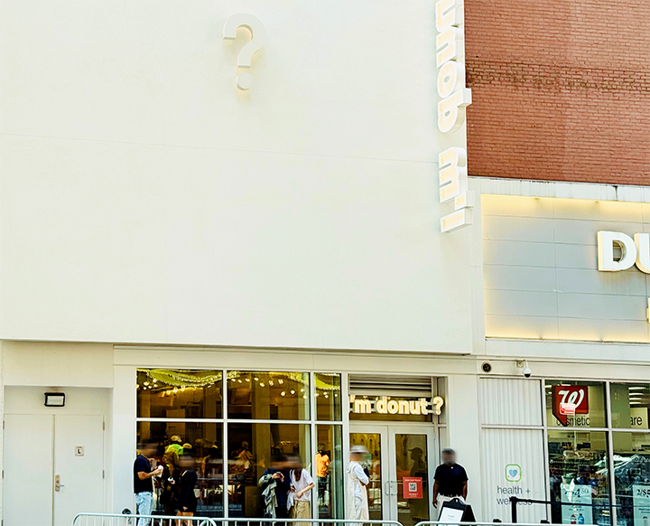 マンハッタンの心臓部・タイムズスクエア。巨大スクリーンと人の波をすり抜けながら歩いていると突如現れる「I’mdonut?」の大きなロゴマーク。