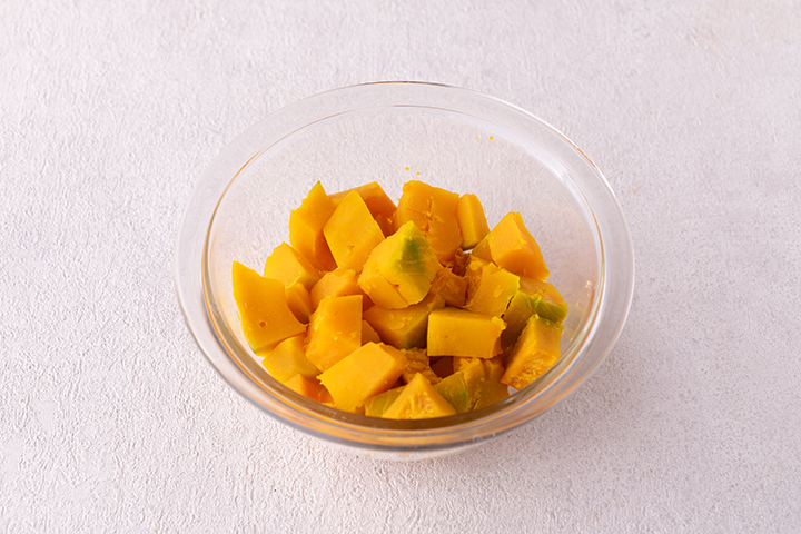 ①かぼちゃは小さめに切って耐熱容器に入れ、ラップをして600Wの電子レンジで6分加熱して柔らかくする。