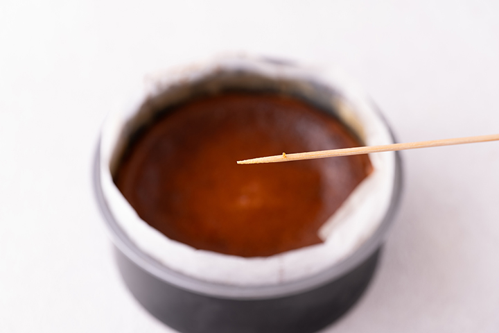 ④竹串を刺してどろっとした生の生地がついてこなければ、オーブンから取り出して粗熱をとり、冷蔵庫で3時間以上しっかりと冷やす。