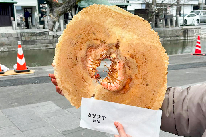 【インパクト大のテイクアウト】顔より大きいえびせん!たっぷり具材のムツゴロウ焼き!行列ができる人気店「カサナヤ沖端」