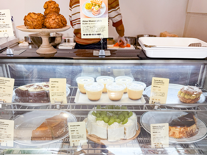 クッキーシュークリーム、パリブレスト、チーズケーキ、プリン、キャロットケーキなど、季節に合わせて常時10種類以上がラインナップ。