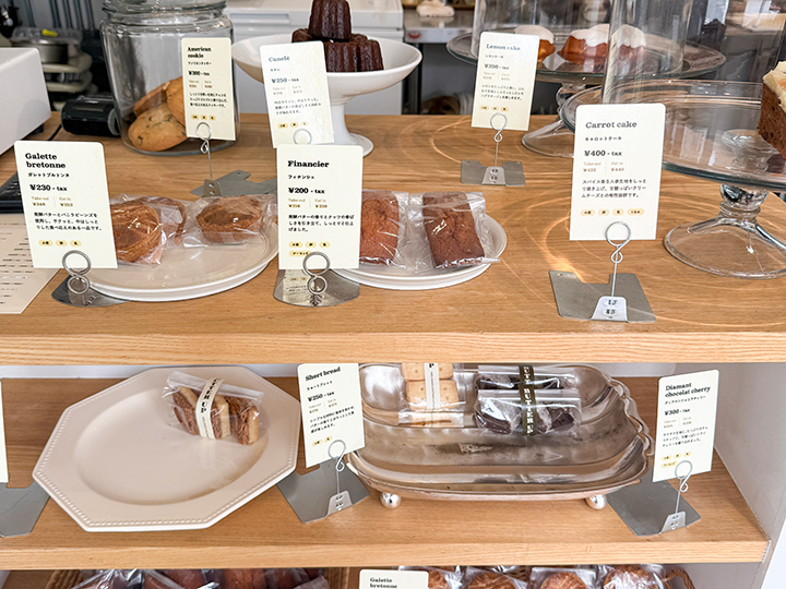 ショーケース横にはクッキーやカヌレ、フィナンシェ、ガレットブルトンヌも並び、どれを選ぶか迷ってしまうほど。