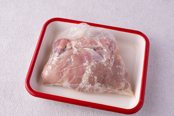 ①鶏もも肉はポリ袋に入れ、塩麹を加えてよくもみ込む。冷蔵庫で1時間〜半日寝かせる。