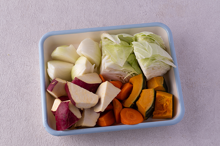 ②キャベツと玉ねぎは大きめのざく切り、さつま芋と人参、かぼちゃは大きめの乱切りにし、さつま芋はさっと水にさらして水気を切る。