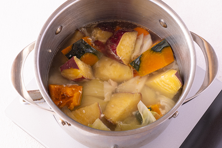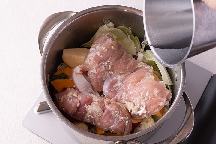 ④鶏肉に火が通っていたら火を止め、鶏肉だけ取り出し粗熱をとる。残りはスープにするので、野菜がかぶるくらいの水を入れ、中火にかける。沸騰したら塩麹や醤油、味噌(全て分量外)で味付けをする。