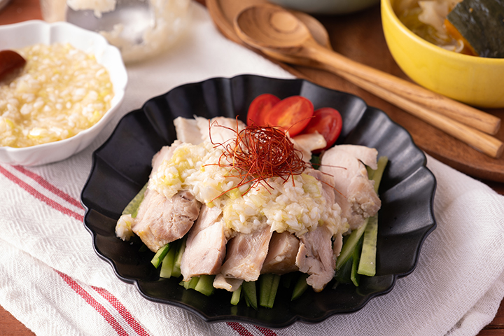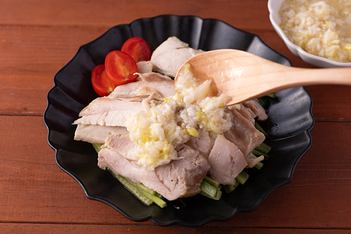⑤鶏肉の粗熱が取れたら、食べやすい大きさに切って、ねぎダレ(後述)をかけ、きゅうりの千切りやミニトマト(分量外)を添える。お好みで糸唐辛子を添えても◎。