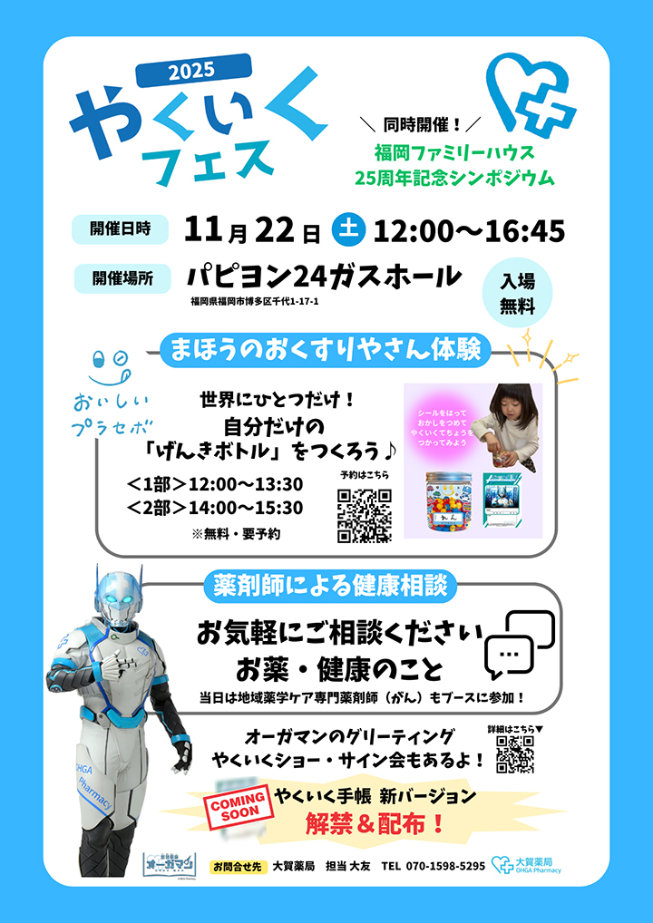 当日は隣接会場で、親子で楽しめるイベント「やくいくフェス」も同時開催!薬剤師ヒーロー・オーガマンのショーや健康相談のほか、「まほうのおくすりやさん体験(※要予約)」など笑顔あふれる企画が並びます。