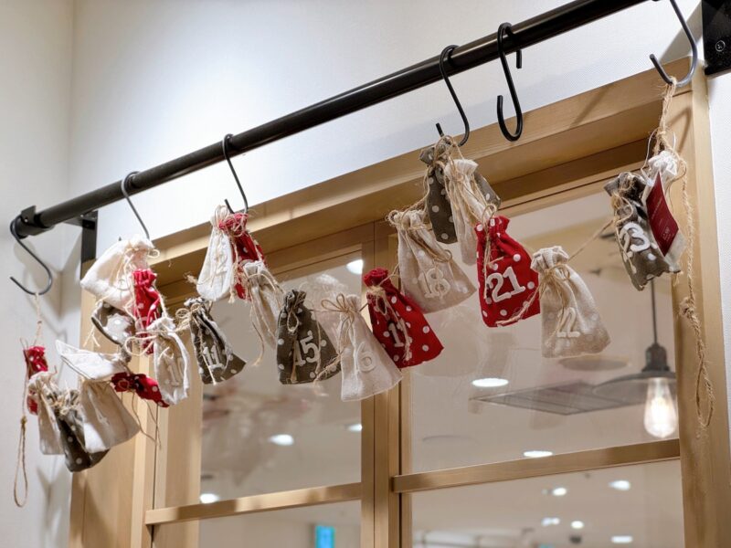 「アドベントカレンダーキンチャクセット」(2,750円)は中にお好きなお菓子や雑貨を入れてクリスマスまでのカウントダウンを楽しむガーランドです。お部屋に飾ったり、クリスマスのオーナメントとして使用するのもおすすめ!何度でも使用できるので毎年活躍しそう♪