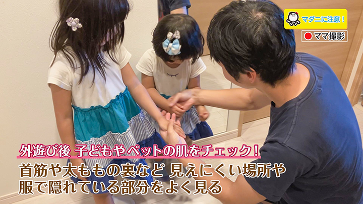 帰宅後は子供やペットの体をよく確認しましょう。特に、首筋や太ももの裏など、見えにくい場所や服で隠れていた部分を念入りにチェックすることが重要です。