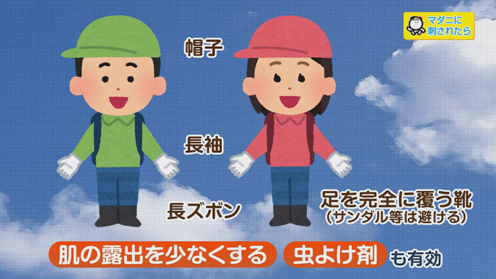 肌の露出を少なくすることが大切です。虫よけ剤の使用も有効な対策です。
