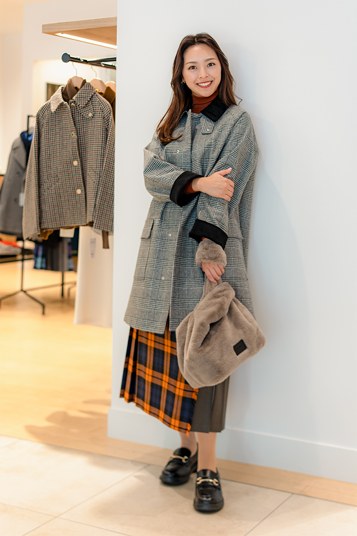 中にはブラウンのタートルネックニットを合わせました。伸縮性のある生地で、このコートから出るブラウンで秋冬らしさを演出。そして、ブリティッシュらしいデザインのオレンジチェックスカート。一枚で主役になるスカートで、ローファーやブーツと合わせて着るのがおすすめです。