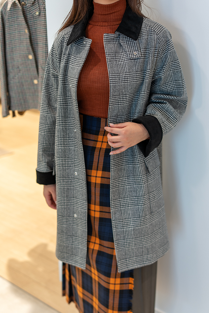 イギリス生まれのブランドMACKINTOSHPHILOSOPHYならではの、英国チェック柄が特徴的なコート。上品でシンプルなチェック柄なので、どんな洋服にも合わせやすいです。襟や袖の裏部分が黒のコーデュロイ生地になっているので、メリハリがあるのもお気に入りポイントです!なにより軽くおしゃれに決まるのが嬉しい!
