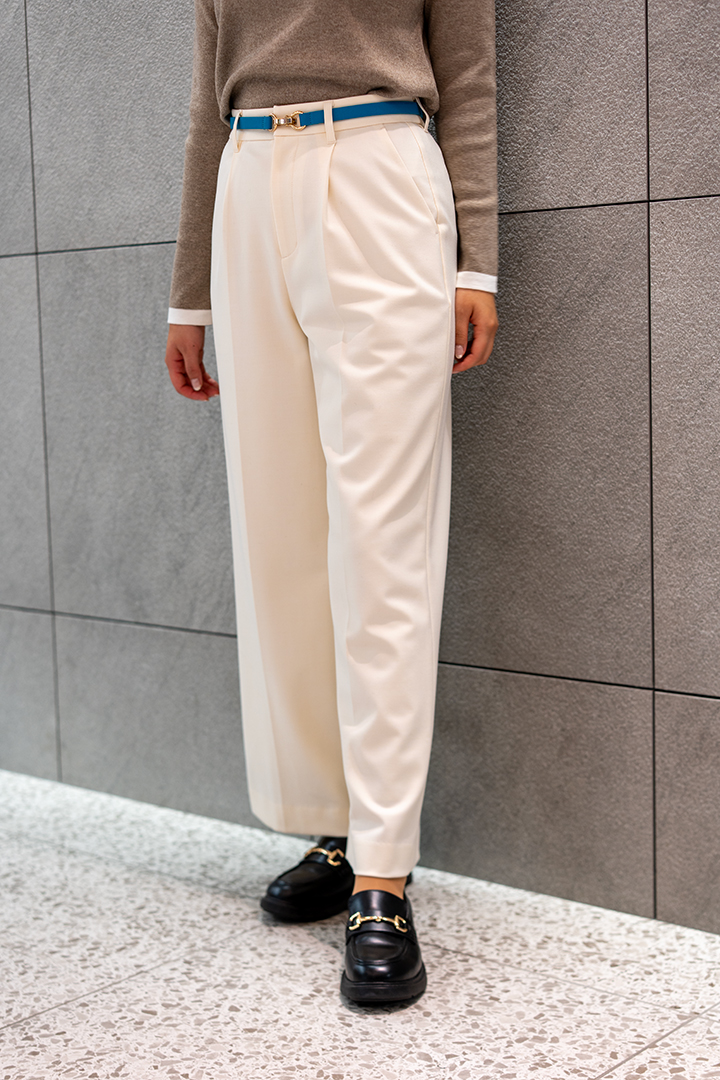 パンツはブランド定番の大人気シルエットの美脚パンツ。ウエスト周りはすっきり、ヒップにゆとりがあり、すとんと落ちるデザインが嬉しいシルエット。アクセントに、ブルーの細ベルトをもってきました。このベルトも明るいブルーにゴールドの金具が上品さをプラスしてくれます。