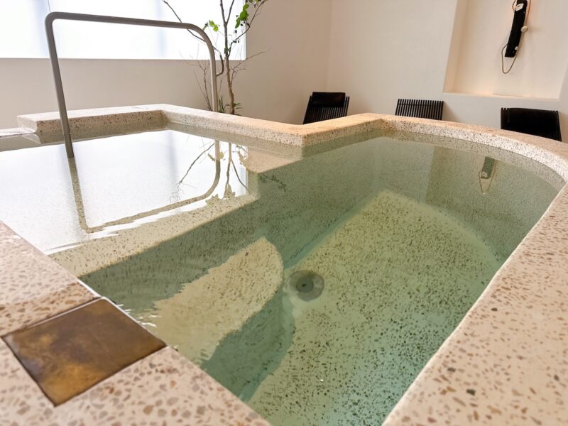 水深110cmの水風呂はしっかりと浸かれる構造に。水風呂に使用されているのは福岡の医療技術から生まれたマイクロバブル設計の「超軟水」です。肌に触れた瞬間のヒリヒリ感がなく、まるでとろけるような感覚に。