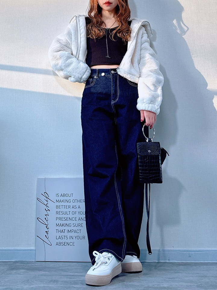 インナーに黒のクロップド丈を合わせることで、前を開けて着た時もお腹周りがスッキリ見え、こなれた印象に仕上がります。