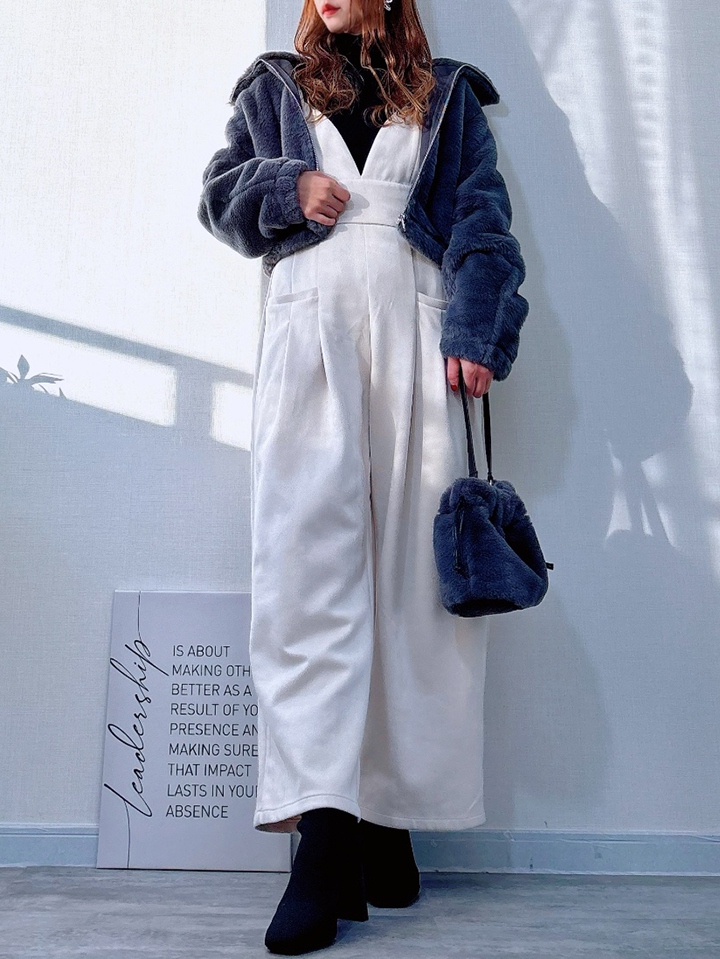 幼く見えがちな白のサロペットも、グレーのブルゾンを羽織ればグッと落ち着いた印象に。