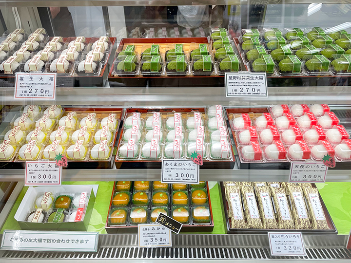 北九州・和菓子の人気店「なごし」。厳選された素材の持ち味をいかし、昔ながらの手造りにこだわった和菓子が並びます。2008年『全国菓子大博覧会』にて名誉総裁賞を受賞した看板商品、星野村抹茶生大福【270円(税込み)】は外せない逸品です。