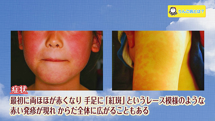 症状は最初に両頬が赤くなり、その後は手足に紅斑というレース模様のような赤い発疹が現れ、体全体に広がることもあります。