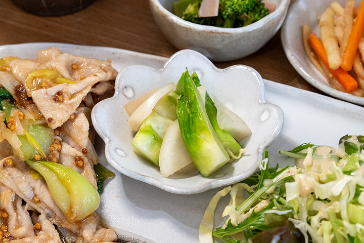 副菜三品の1つが「つぼみ菜とカブの炒め物」。つぼみ菜のコリコリとした食感、ほのかな苦みに春を感じました。