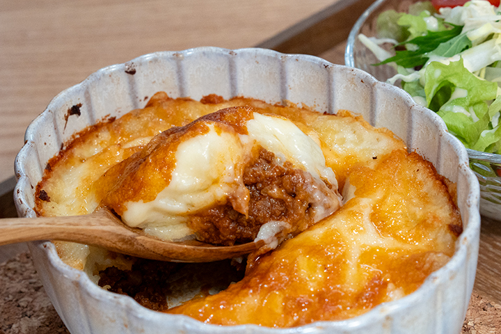 ひき肉は酸味が程よく飛び、コクと旨味が凝縮され、そこに滑らかで優しい甘みのあるマッシュポテトが口当たりをクリーミーにまとめます。