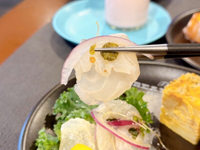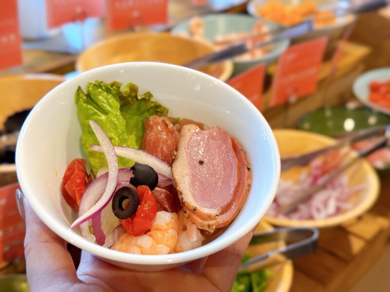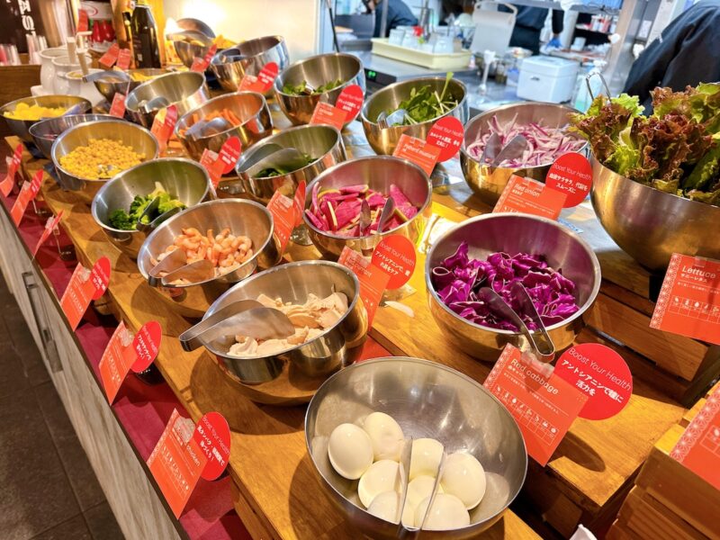 フロントの隣にある朝食会場に足を踏み入れると、まず目に飛び込んでくるのが圧巻のサラダバー。福岡県産の紅芯大根や水菜、パクチーなど10種類以上の新鮮な野菜や、エビ、チキンなどの具材がずらりと並んでいます。