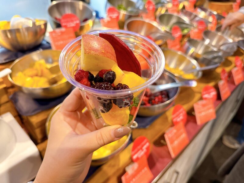 また、サラダバーの隣には、好きな野菜やフルーツを選んで目の前で作ってもらえる「フレッシュスムージー」のコーナーも。ヨーグルトベースなのでまろやかで、野菜が苦手な方にも飲みやすい仕上がりになっています。(ちなみに、素泊まりの方でも朝はスムージーが1杯無料でもらえるサービスもあるそうです!)