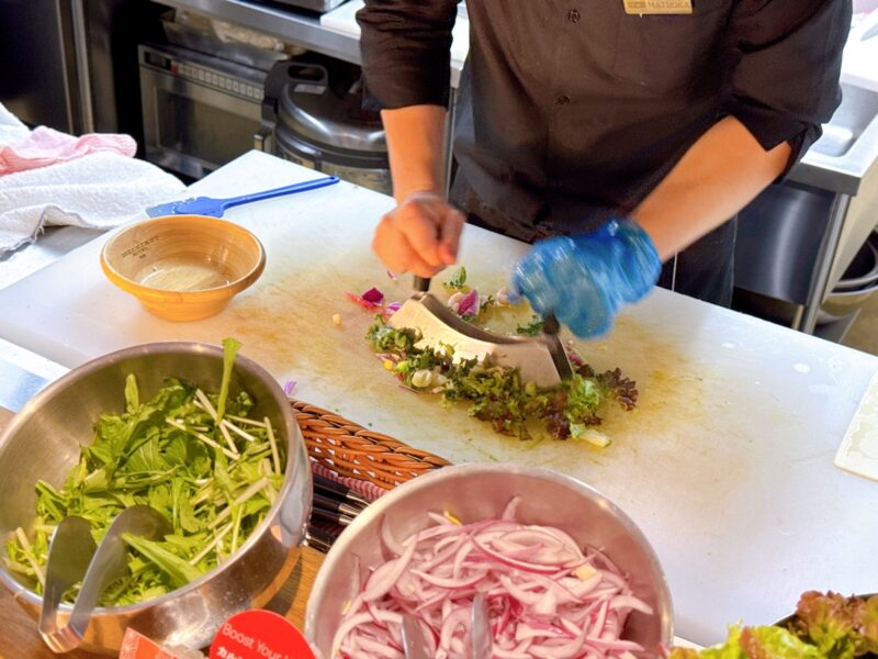 好きな具材をお皿に選んでスタッフに渡すと、特殊な包丁「メッツァルーナ」を使って目の前でトントンと細かく叩き切ってチョップドサラダにしてくれるんです!その組み合わせはなんと最大200通り以上。