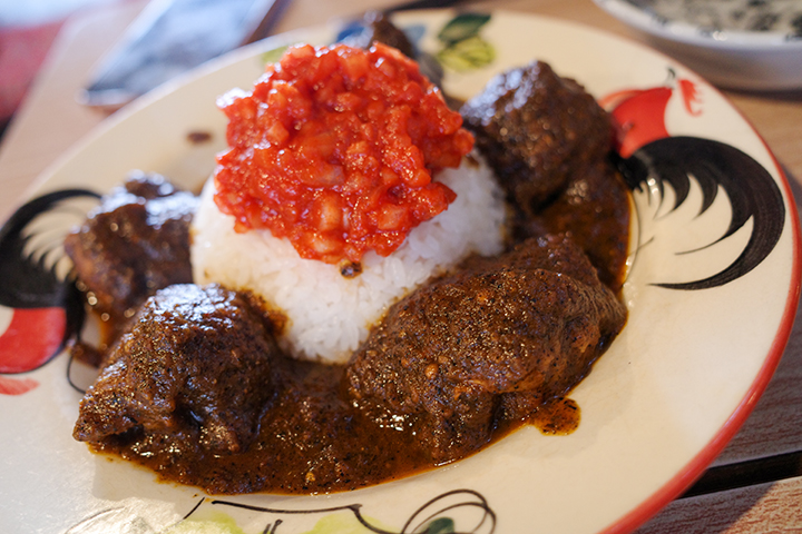 スパイスや唐辛子を使った伝統的なソース料理で、こちらではチョコレートは使用せず、焦がした野菜の旨みをベースに仕上げられています。