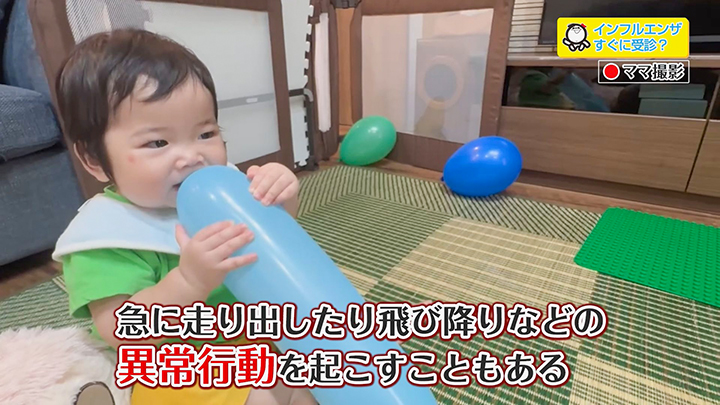 主な症状は、高熱、咳や鼻水、だるさなどですが、急に走り出したり、飛び降りなどの異常行動を起こすこともあります。