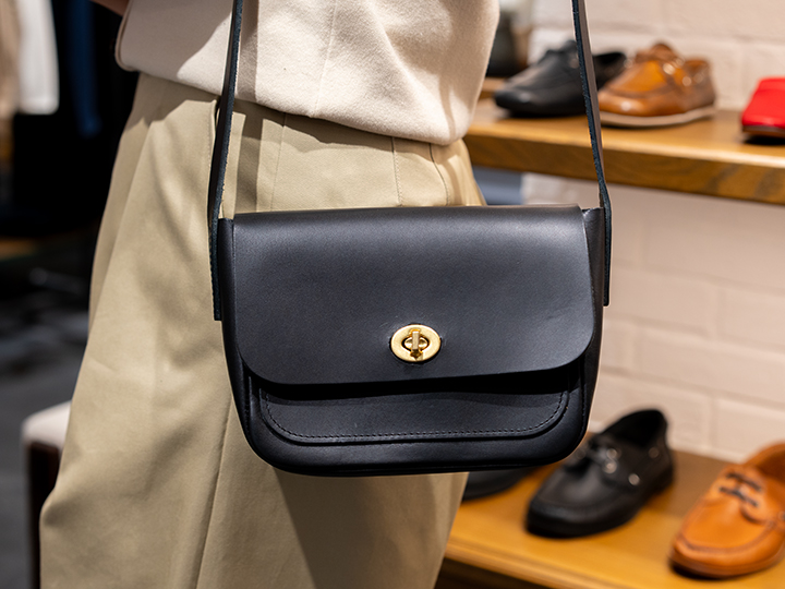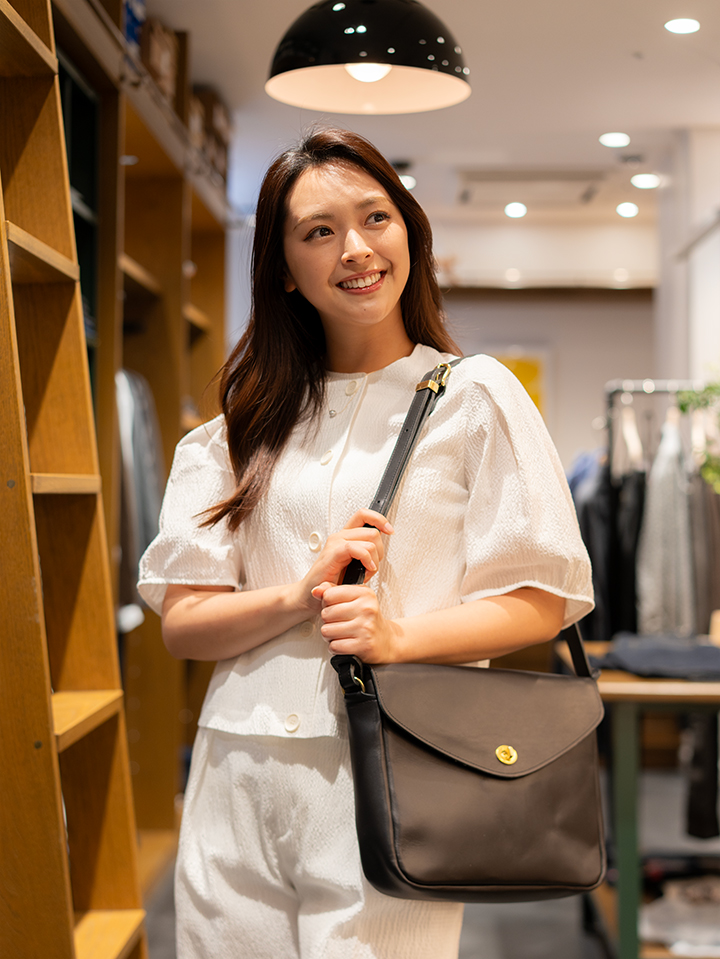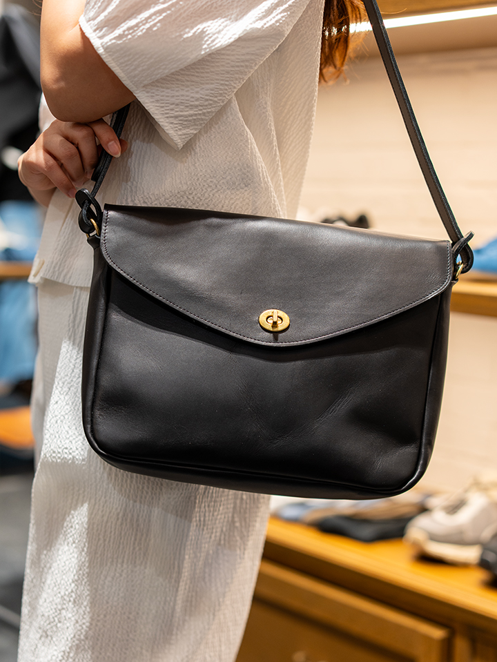 バッグにはブラックのショルダーバッグを。全体のバランスを整えてくれる小物で、滑らかな曲線のあるデザイン。レトロ感のあるゴールドのパーツもとっても可愛いかったです。