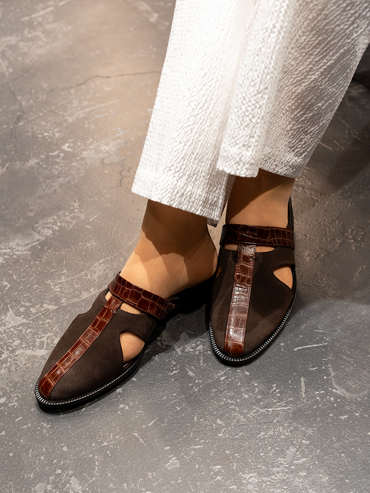 丸みのあるトゥと華奢なバックストラップが特徴的。ストラップがあることでとても歩きやすく、羊革を使用した柔らかい素材なので、包み込んでくれるようなフィット感もあります。
