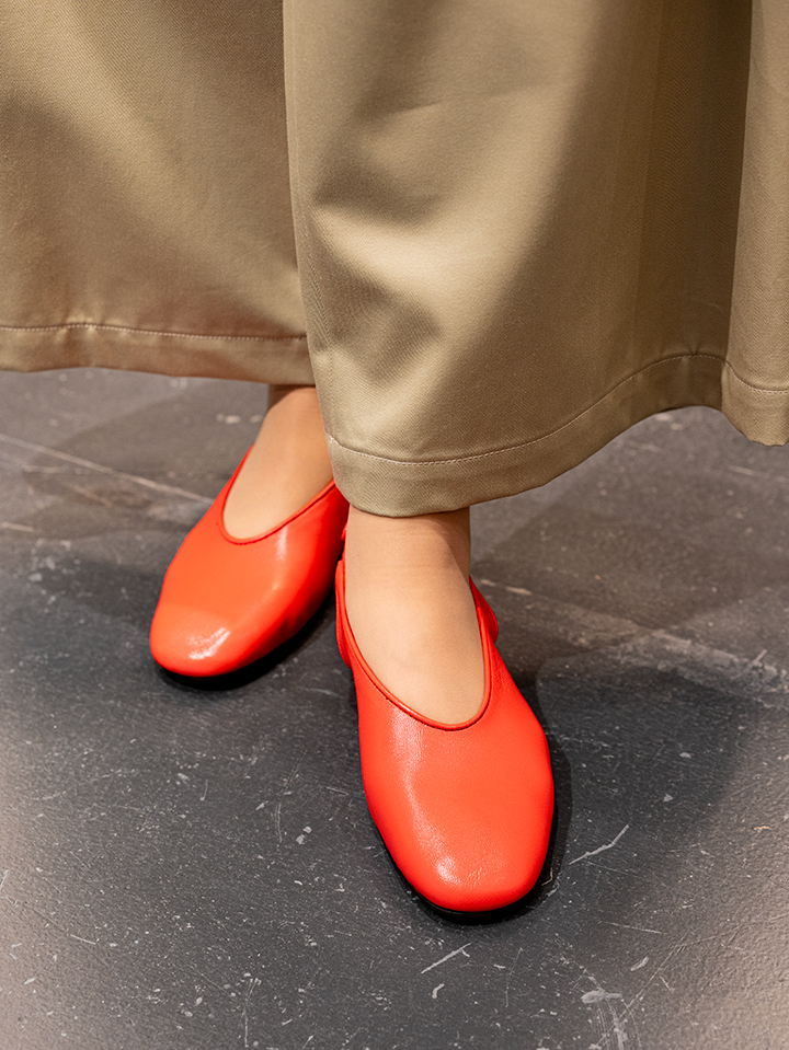 足元にはポイントになる赤いフラットシューズをチョイス!