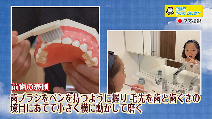 【前歯の表側】:歯ブラシをペンを持つように握り、毛先を歯と歯ぐきの境目に当てて、小さく横に動かして磨きます。