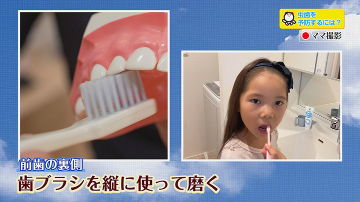 【前歯の裏側】:歯ブラシを縦に使い、1本ずつ丁寧に磨きます。
