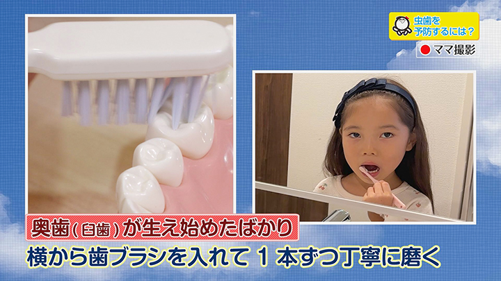 【6歳臼歯】:生え始めは背が低いため、歯ブラシを横から入れて1本ずつ磨くのがコツです。小学校三年生頃までは子供だけでの歯磨きでは磨き残しが出やすいので、仕上げ磨きと週三回ほどのフロスをしてあげましょう。