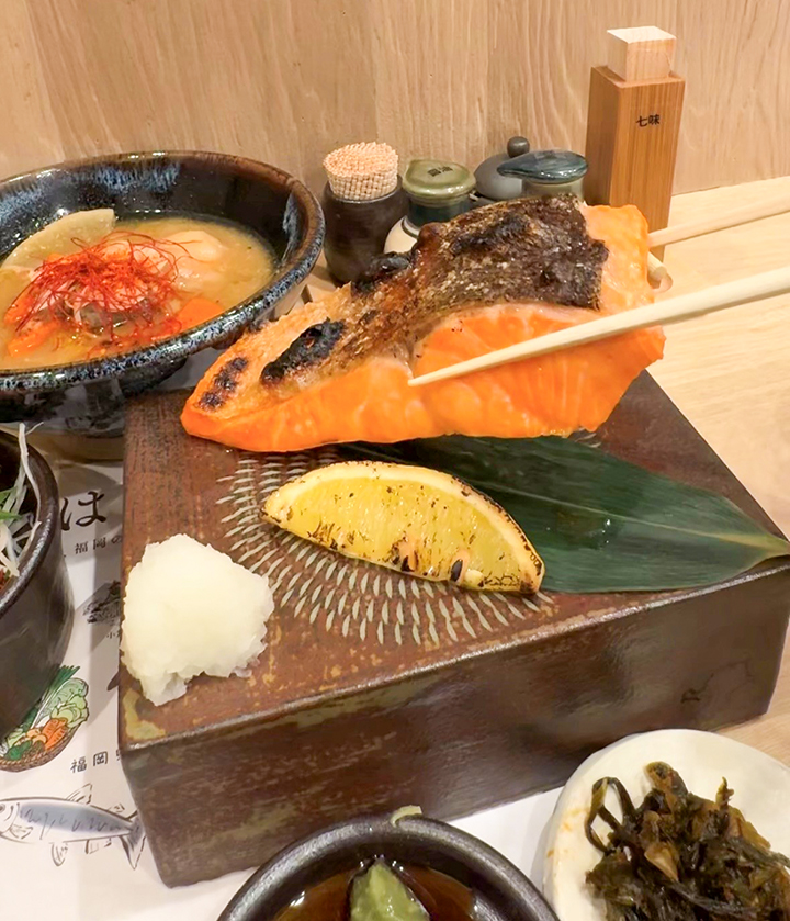 色から惹き込まれるお刺身は色鮮やかなお刺身は甘みがしっかり感じられ目でも楽しめます。出汁が効いた豚汁は身体にしみるしご飯が足りなくなる美味しさ。海苔や明太子(才谷屋)、辛子高菜まで福岡の恵みをまるごと味わえますよ!ご飯のお供は追加料金で色々な種類がありますよ。