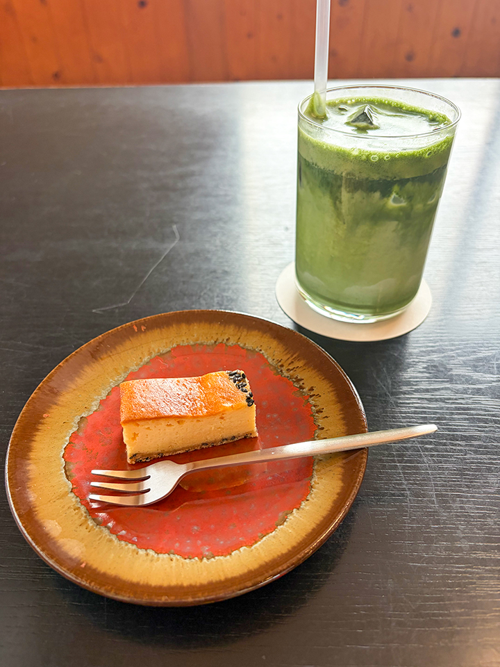 さらに、ぜひおすすめしたいのがデザートセット。田川市の「おやつ工房206」さんの薩摩芋チーズケーキと、KITOKIさん特製の濃厚な抹茶ラテ。